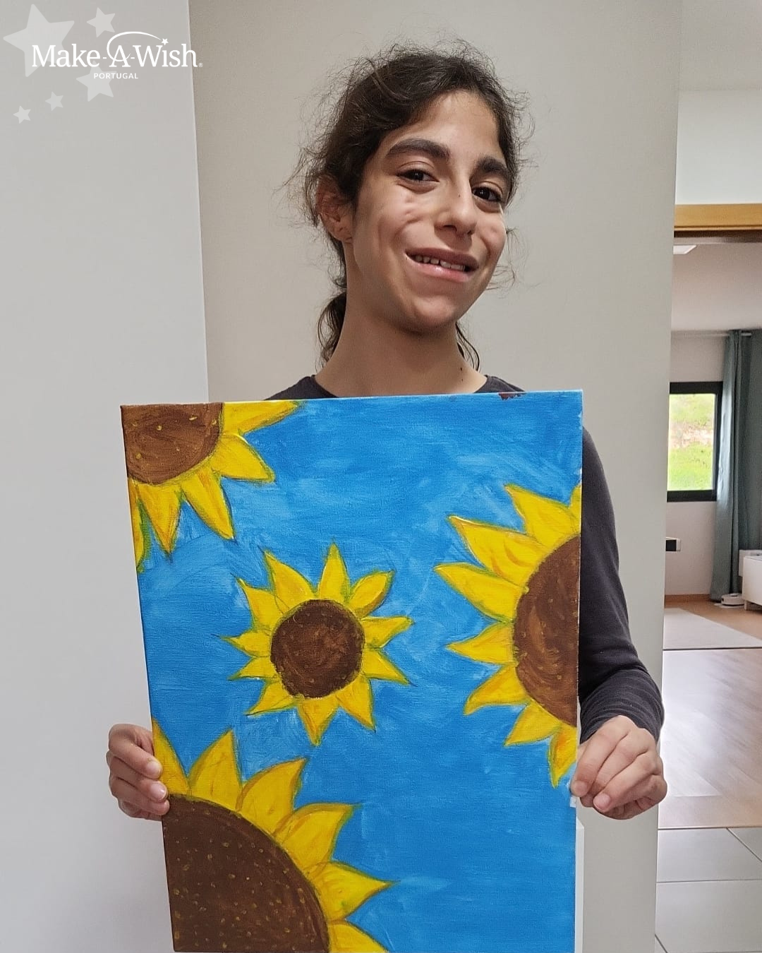 Enquanto aguardava ansiosamente o dia da realização do seu desejo, a Alice divertiu-se com as atividades propostas pelas voluntárias: revelou o seu talento nas artes e pintou um quadro de girassóis incrível!