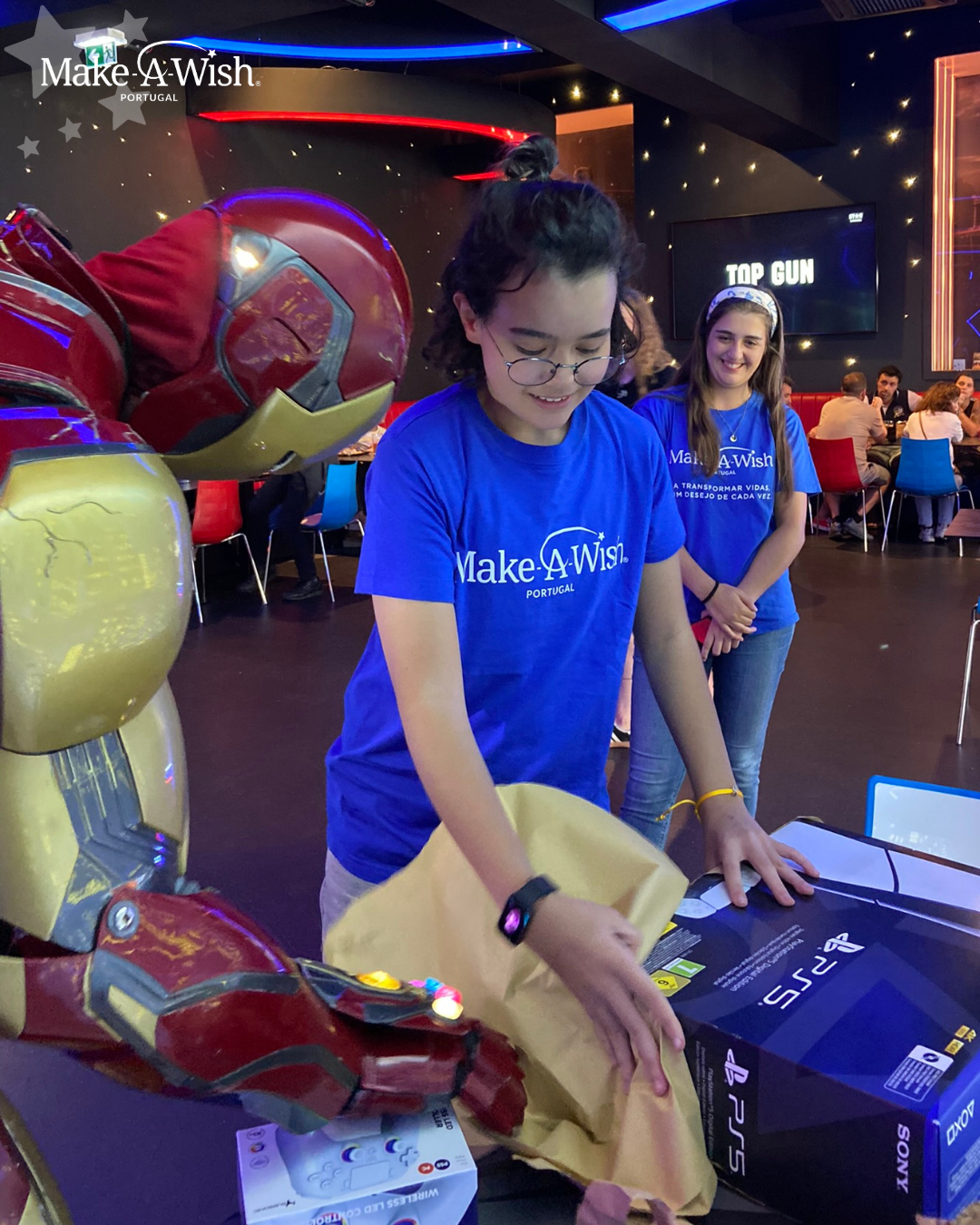 Pediu os seus pratos favoritos e desfrutou de tudo a que tinha direito! Para Aysha, este já fora um dia perfeito, mas as voluntárias ainda tinham mais uma surpresa nos seus planos. No fim da refeição, o Homem de Ferro levou a Aysha a conhecer o espaço, percorreram os diferentes artigos em exposição, até chegarem ao destino final – em cima de uma das mesas estava um grande embrulho da Make-A-Wish! A cada pedaço de embrulho que rasgava, o sorriso da Aysha crescia cada vez mais. Aos poucos, surgiu a consola que tanto desejara – o seu desejos estava realizado!