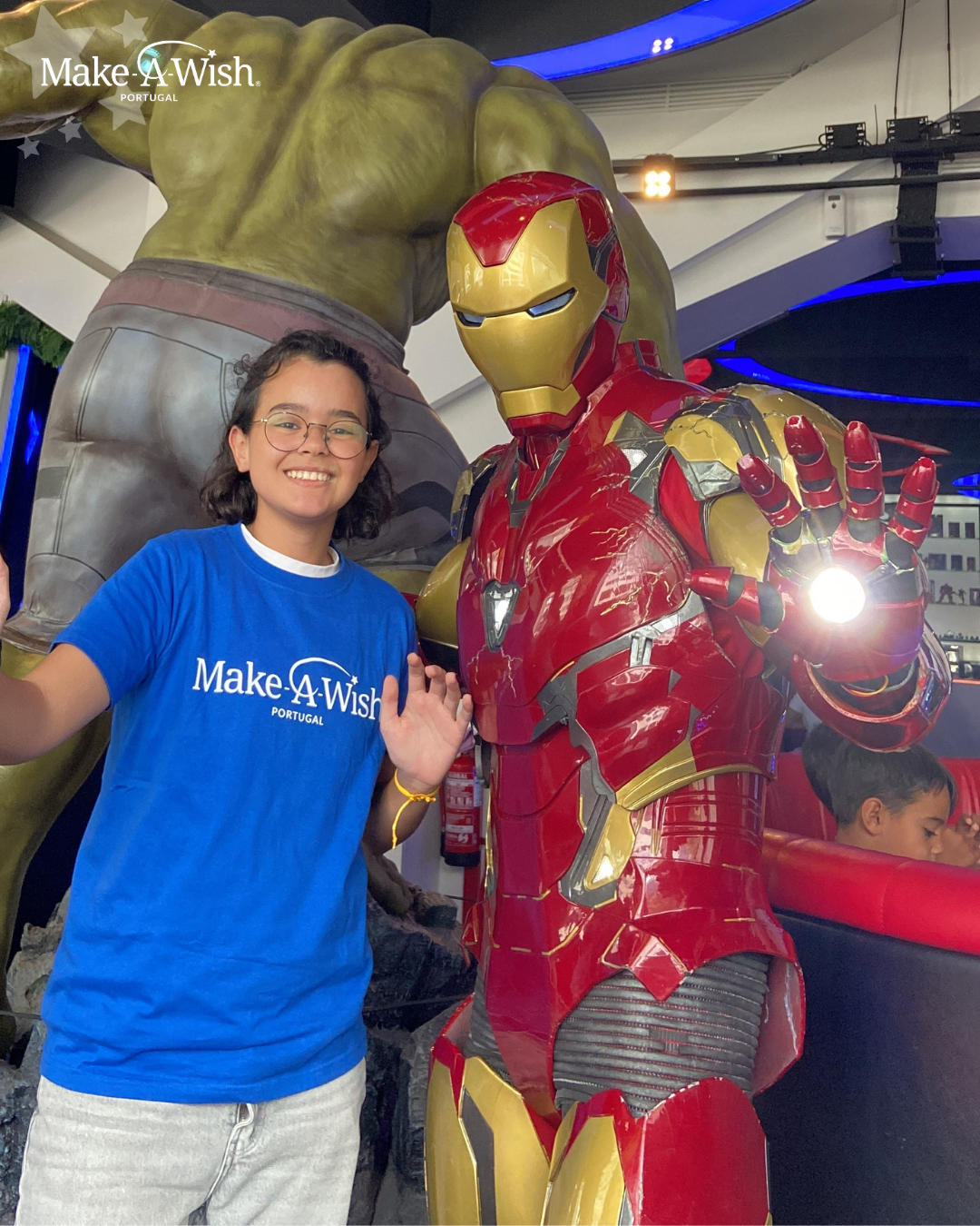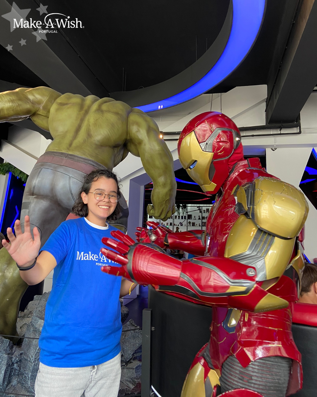 De seguida, a maior surpresa de todas! A Wish Kid pensava que ia terminar o encontro com as voluntárias num almoço descontraído, mas assim que chegou ao restaurante foi recebida pelo próprio Homem de Ferro! A Aysha nem conseguia acreditar! Com um sorriso gigante, abraçou este herói e seguiu-o para dentro do World of Heroes, um restaurante fora do comum que a transportou diretamente para o covil da Marvel!