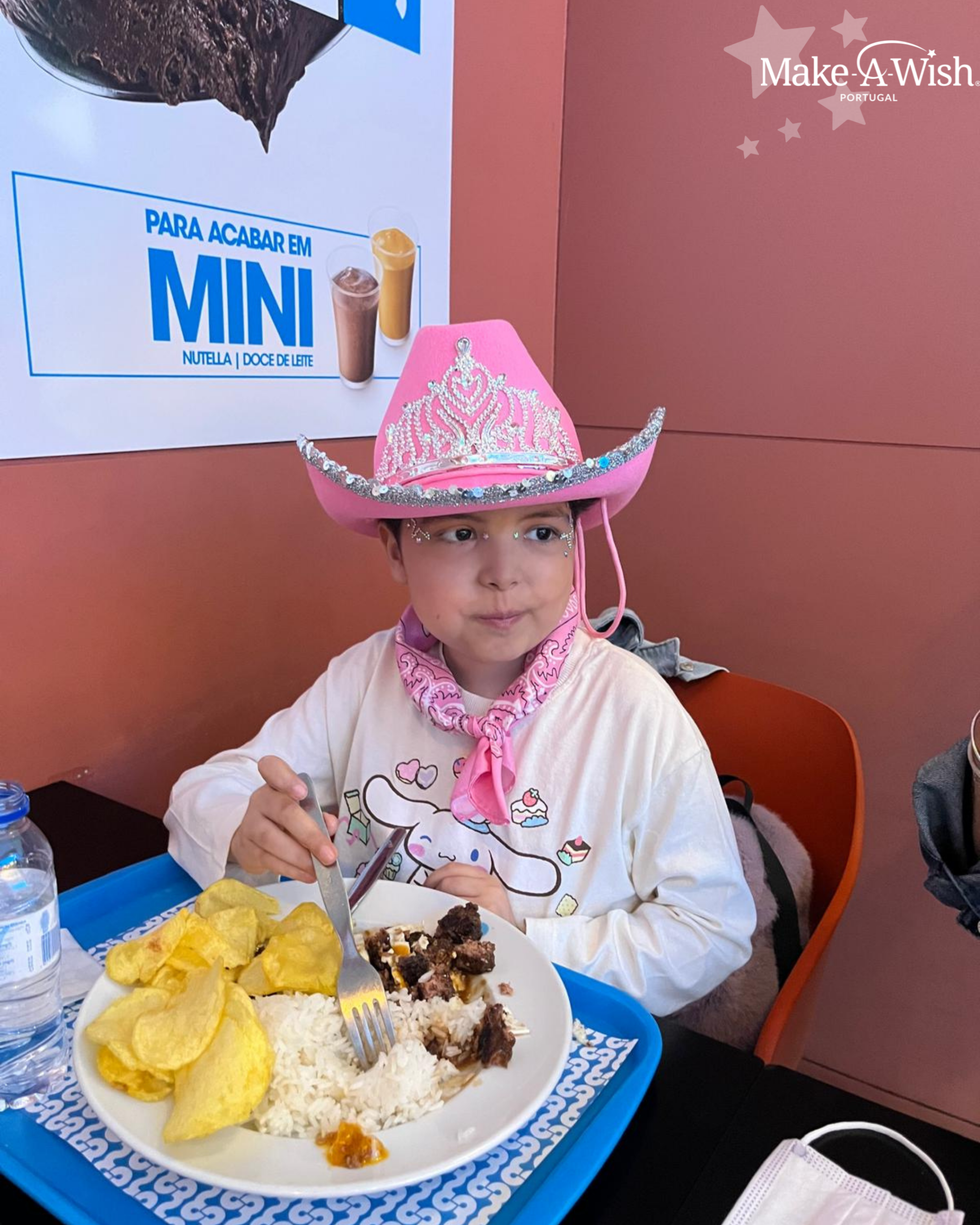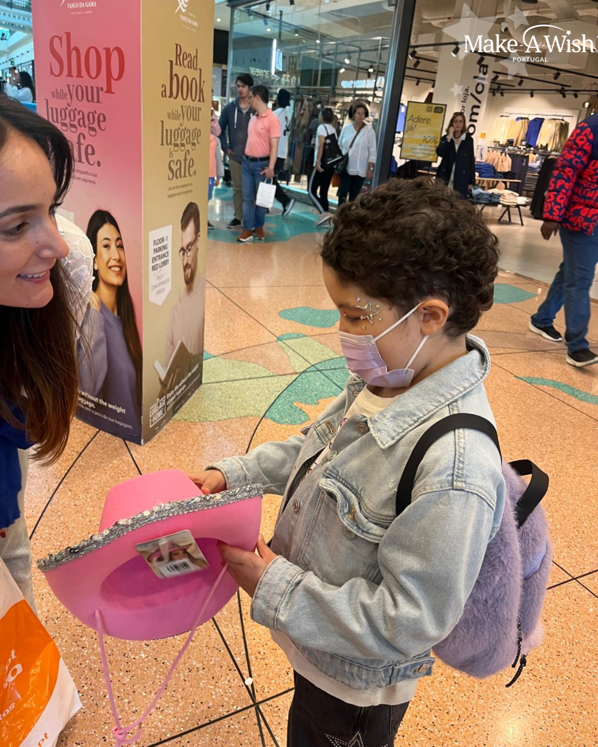 No dia do seu desejo, a Camila equipou-se a rigor, com muitos brilhantes! Encontrou-se com as suas voluntárias Make-A-Wish, que lhe entregaram a peça chave para completar o look – um chapéu de cowboy cor-de-rosa.