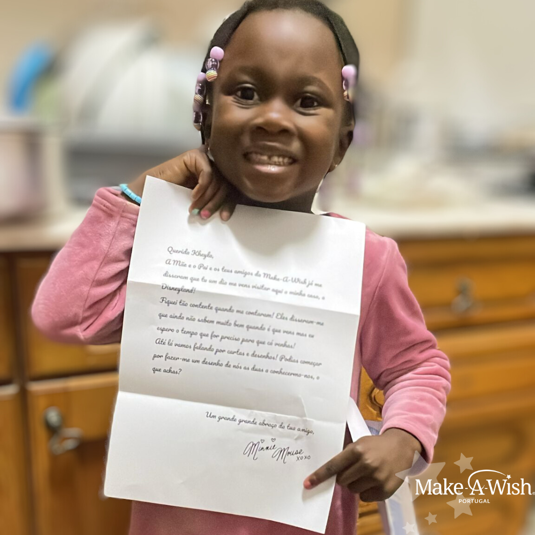 O seu grande desejo Make-A-Wish era ir à Disneyland Paris e concretizar o sonho de conhecer a Minnie, a sua personagem favorita! Enquanto aguardava a realização do seu desejo, os voluntários da Make-A-Wish surpreenderam-na com várias cartas da Minnie, que estava desejosa para conhecer a sua fã n.º 1 e que lhe lançou vários desafios, como desenhar como seria o seu quarto na Disney, as partes preferidas do parque, ou o seu encontro com as personagens.