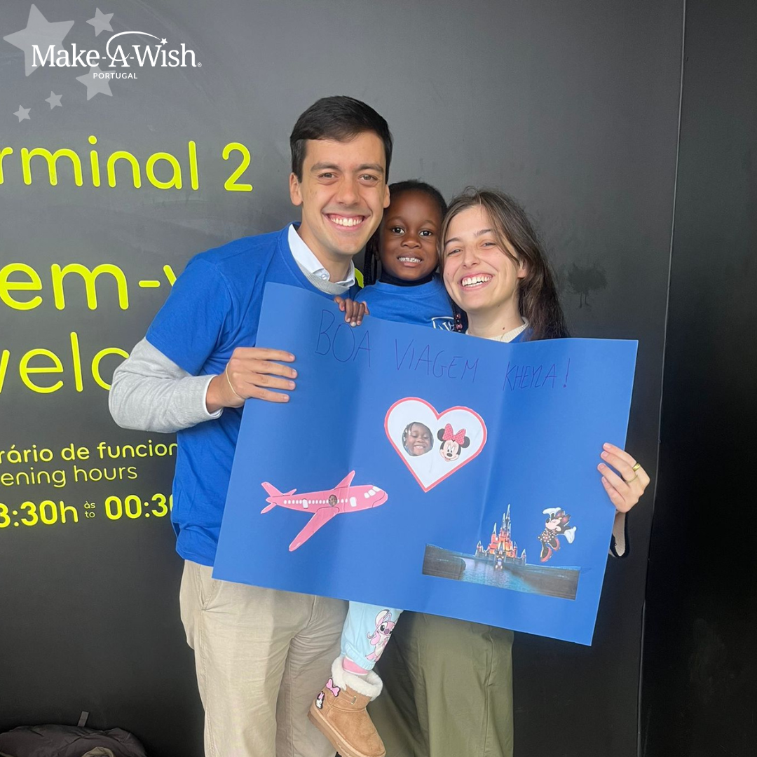Ao chegar ao aeroporto, a Kheyla foi surpreendida com uma receção em grande pelos voluntários Make-A-Wish, com um cartaz que dizia “Boa Viagem Kheyla!”. A Kheyla correu logo para os braços dos voluntários e abraçou-os com um sorriso gigante!