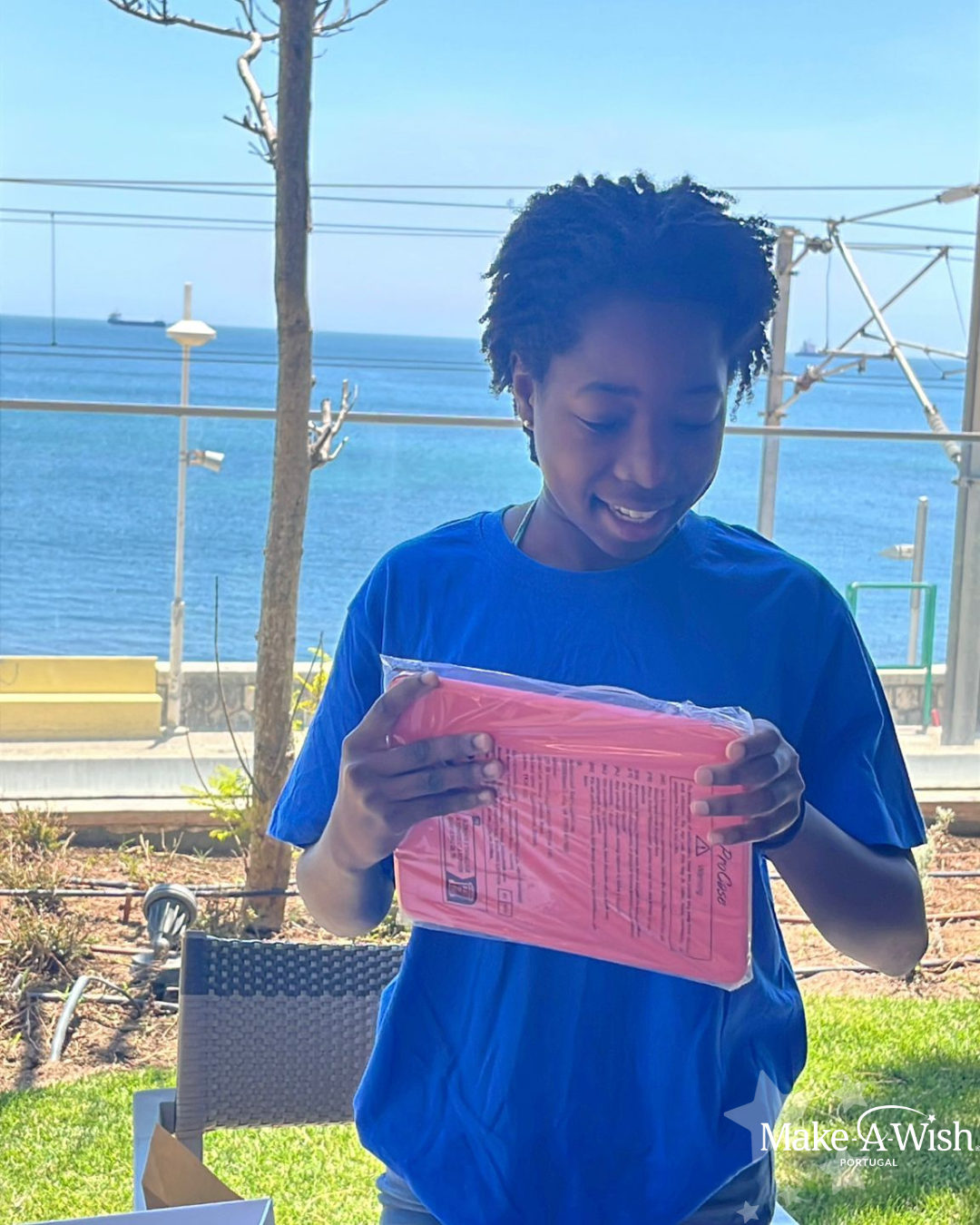Pronta para as sobremesas, chegou a surpresa mais doce de todas! As voluntárias entregaram à Swane um embrulho da Make-A-Wish e a Wish Kid soube logo o que seria. Com um sorriso gigante, desembrulhou a caixa e descobriu o tablet dos seus sonhos. Nem conseguia acreditar! Não perdeu tempo a adicionar a sua nova capa cor de rosa e começou logo a desenhar uma linda flor!