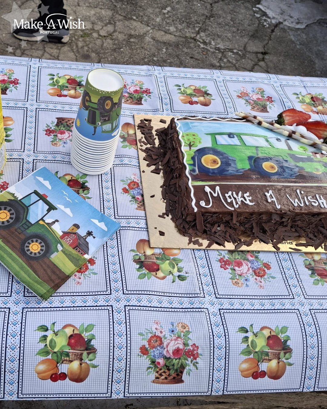 Chegou o momento de o surpreender! As voluntárias prepararam uma festa temática, com decorações de tratores e até um delicioso bolo personalizado. O Wish Kid adorou tudo, mas a sua parte favorita foi o trator, claro! Assim que o viu, não o voltou a largar. Começou logo a dar voltas pelo quintal e a transportar coisas no atrelado – agora, sim, está pronto para ser um agricultor a sério e ajudar o seu pai nos trabalhos do quintal!