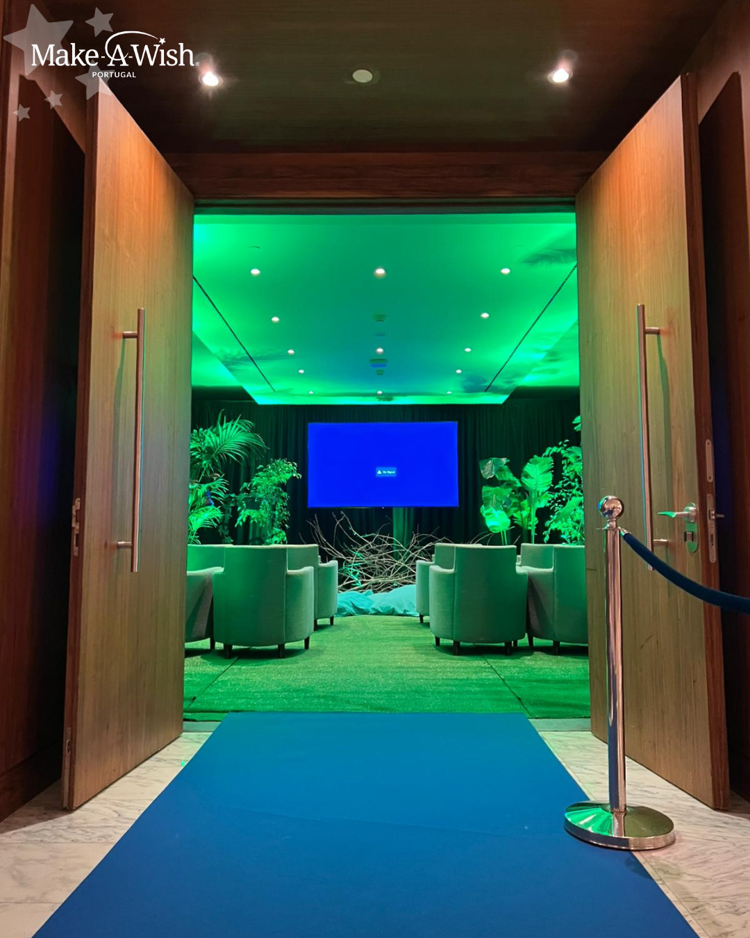 No dia do seu desejo, o Hotel Corinthia transformou-se num novo espaço! O Filipe foi recebido por uma carpete azul, recolheu os seus bilhetes de cinema na entrada e levantou as pipocas, que não podiam faltar. Chegou o momento de entrar na sala de cinema e o que encontrou foi simplesmente incrível! Com luzes verdes, plantas por todo o lado e rodeado de dinossauros, o Filipe sentiu-se imediatamente em casa no seu universo favorito – Jurassic Park!