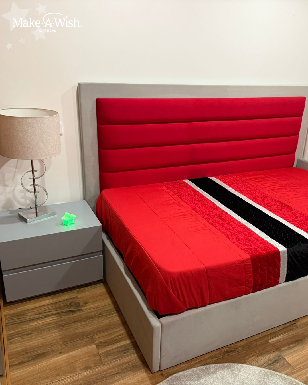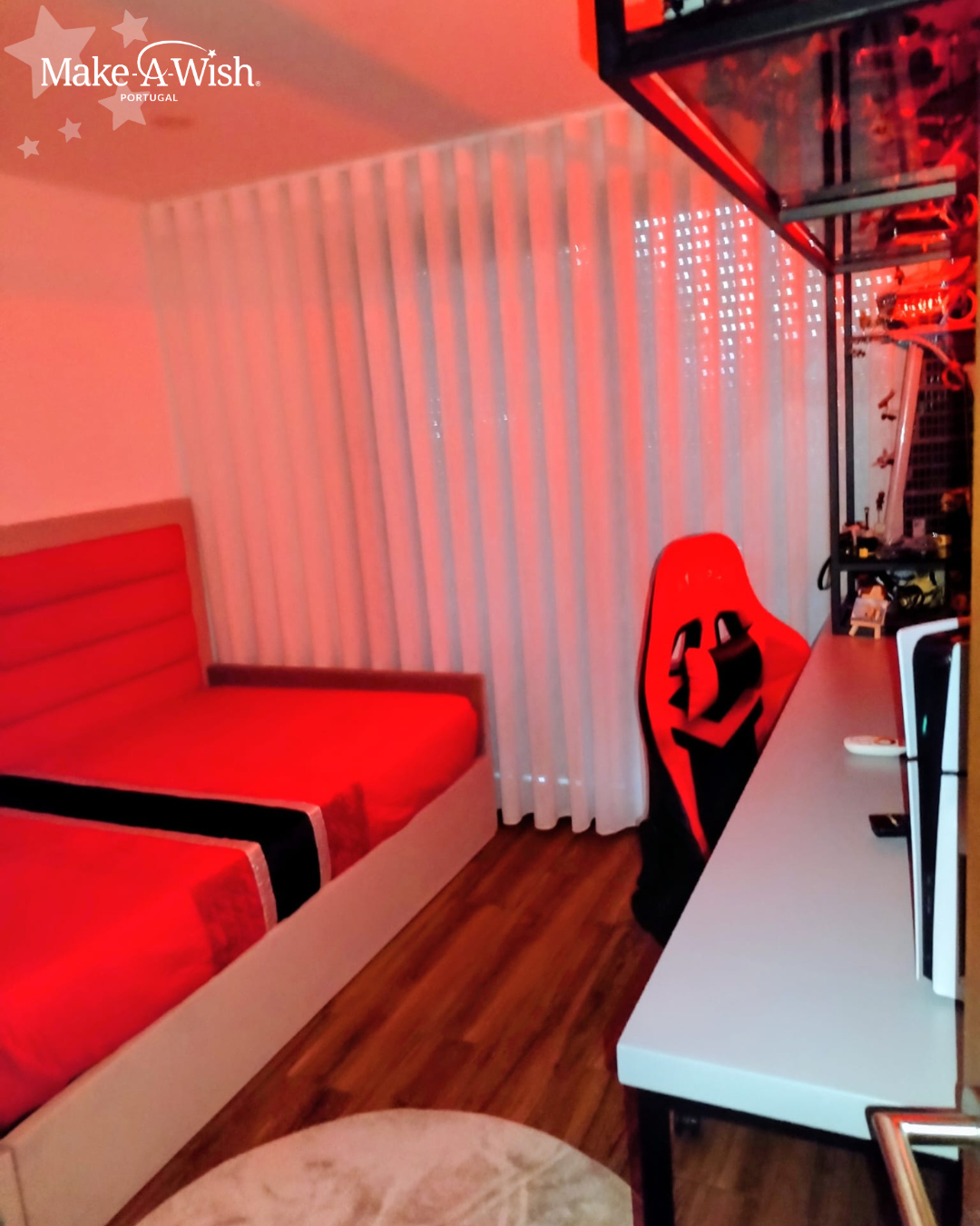 Em conjunto com a sua família e voluntários Make-A-Wish, o Leandro construiu o moodboard do que não poderia faltar no seu quarto! Queria modernizar a decoração e adaptá-la aos seus gostos, ter um espaço de estudo e de entretenimento confortável e colocar os seus legos favoritos em exposição!