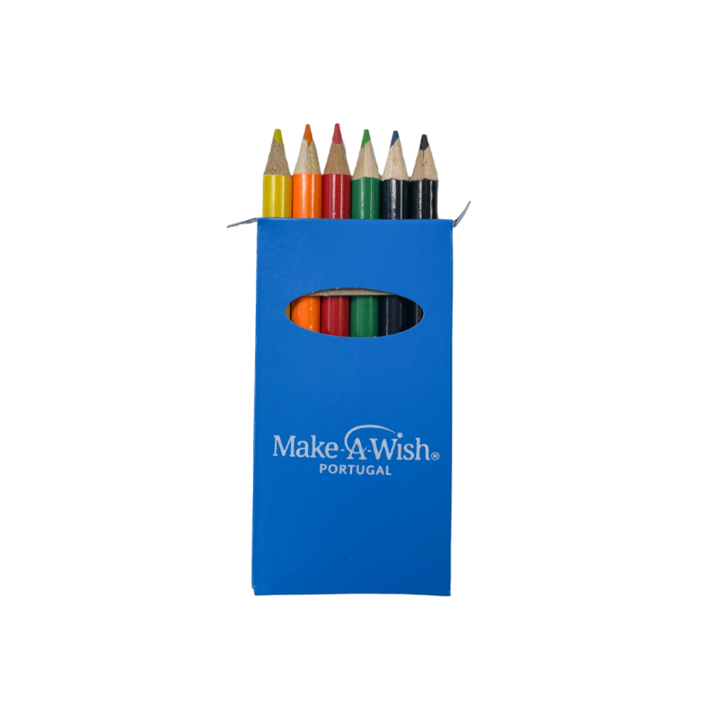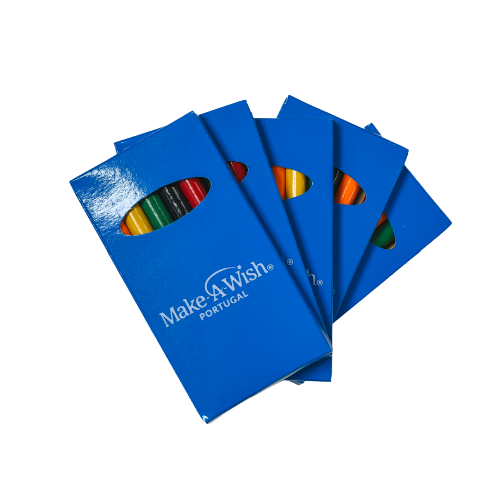 Uma pequena caixa de Lápis de cor que transporta a esperança e o poder transformador da missão da Make-A-Wish de transformar vidas de crianças e jovens gravemente doentes.