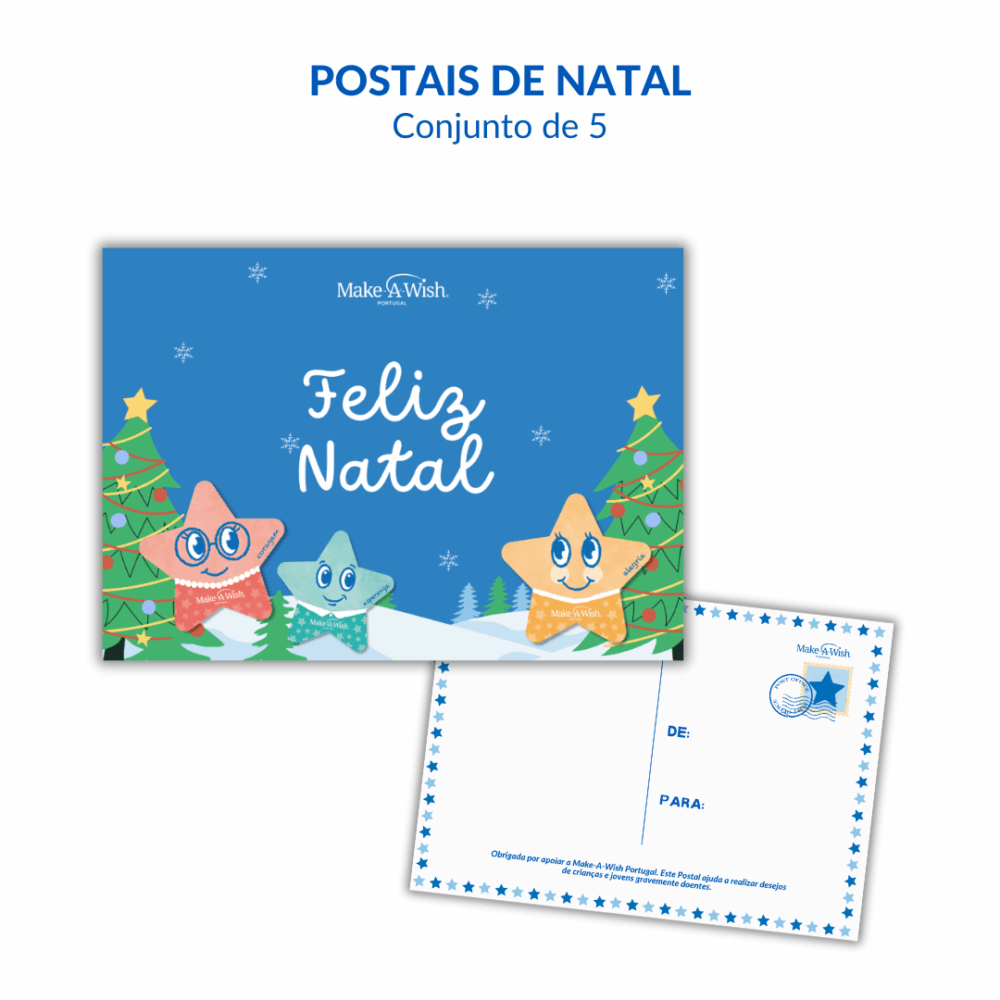 Com o pack de 5 postais Make-A-Wish, é possível partilhar alegria e esperança, transformando simples votos de “Feliz Natal” em gestos solidários que ajudam a realizar desejos de crianças e jovens gravemente doentes.